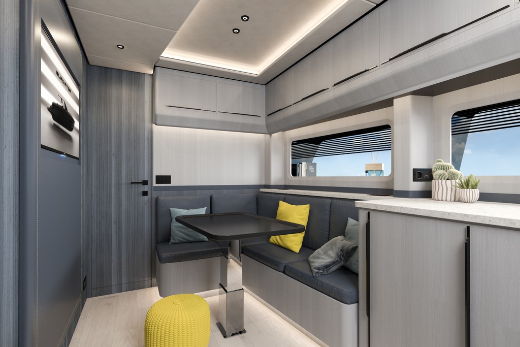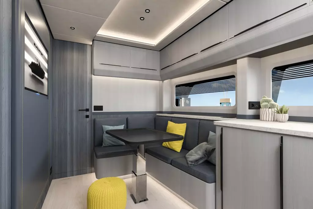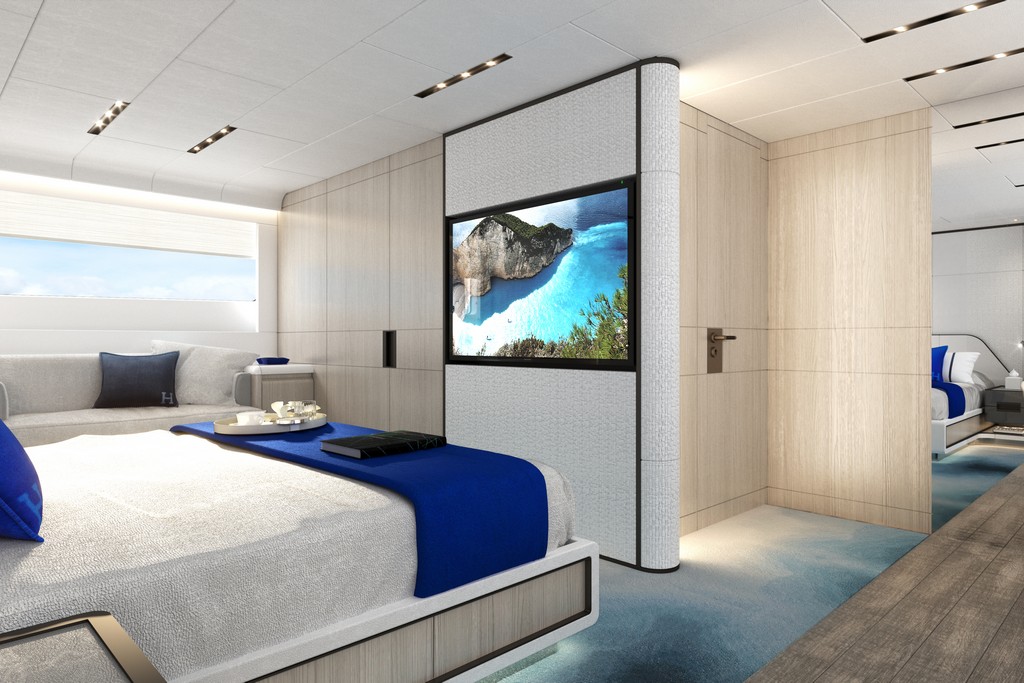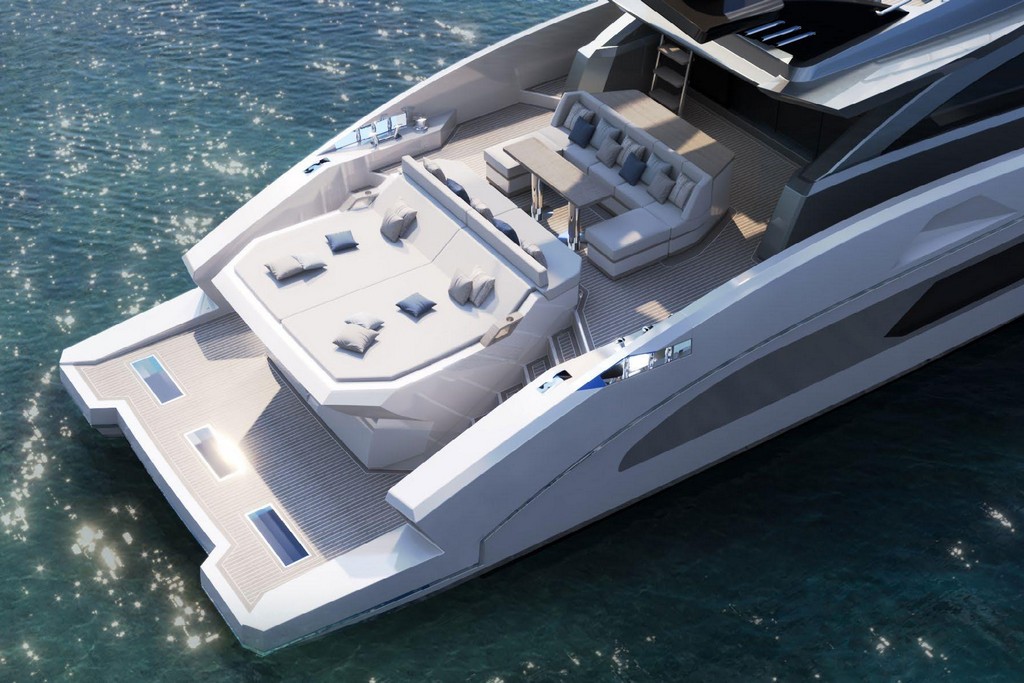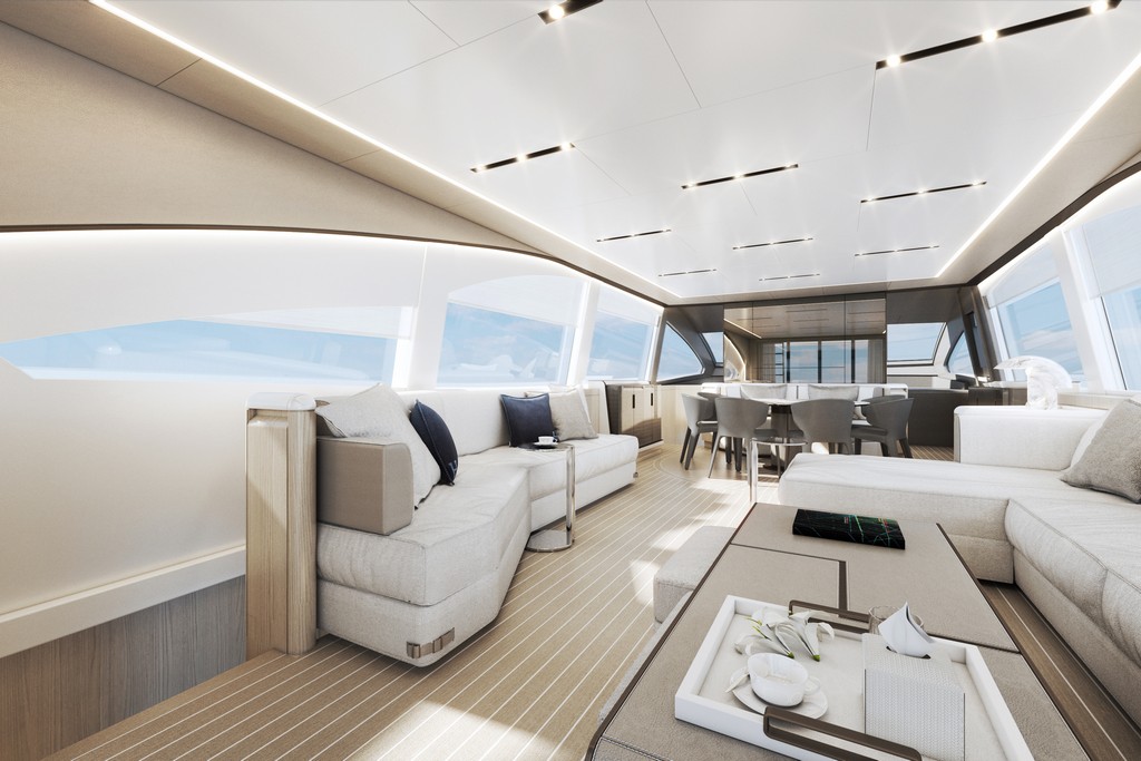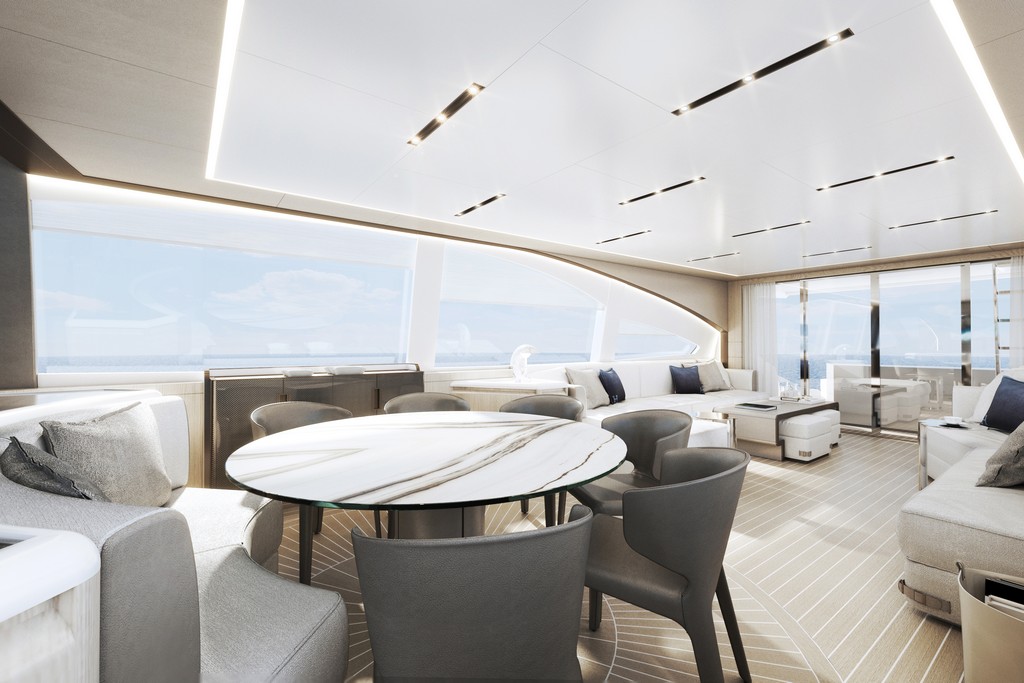 New features will include a reverse sofa above the swim platform for clients who like water sports; side lockers for cockpit fenders; built-in reverse armchairs forward; and a sizable tender garage.