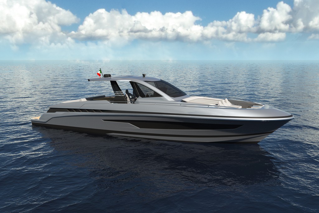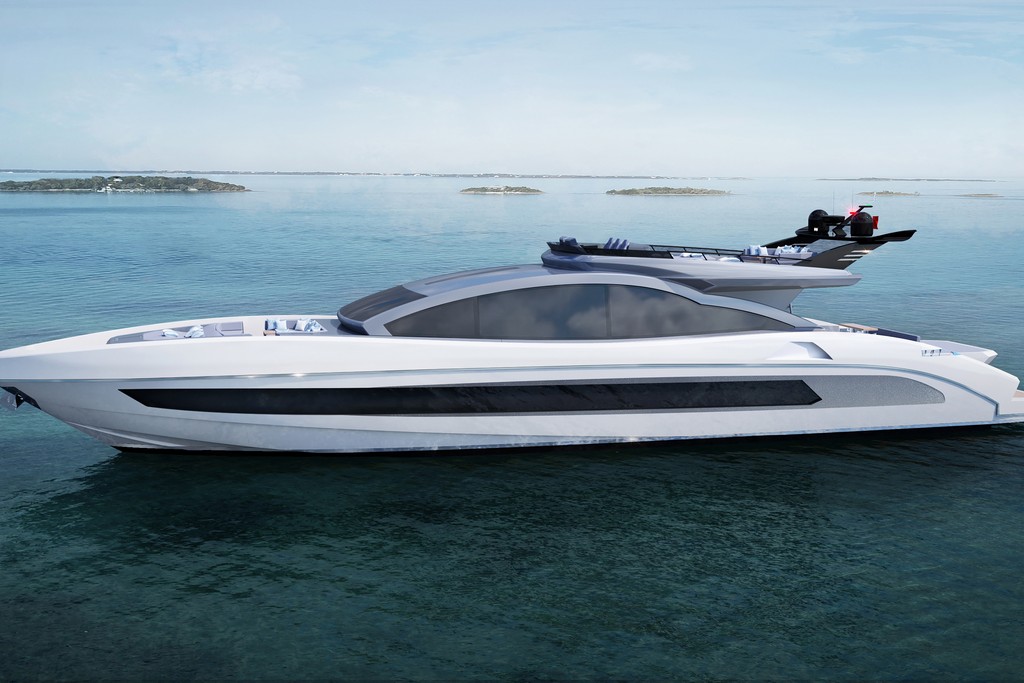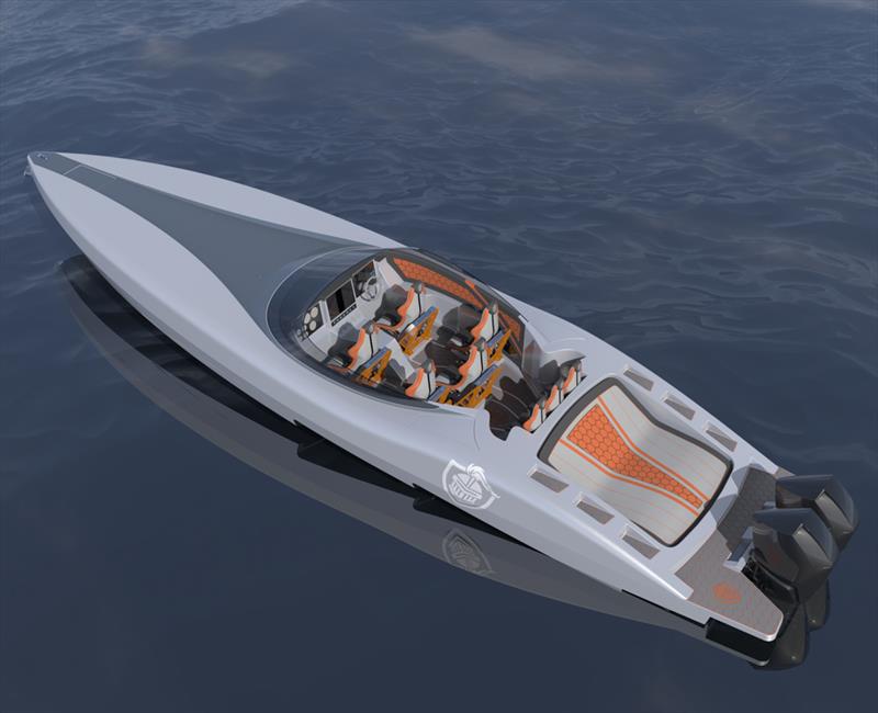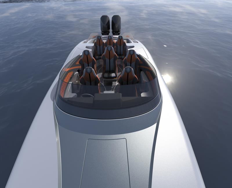 The base-model power will be twin 725-horsepower Volvo Penta D11s. Options will include triple or quadruple 600-horsepower Mercury V12s. Range is expected to be 240 to 350 nautical miles at cruising speeds. Construction will be vacuum-bagged E-glass with carbon-fibre components, including the hardtop.