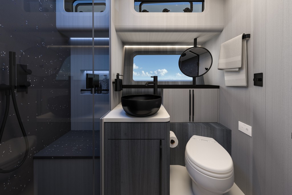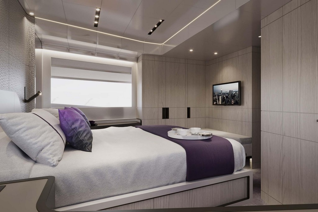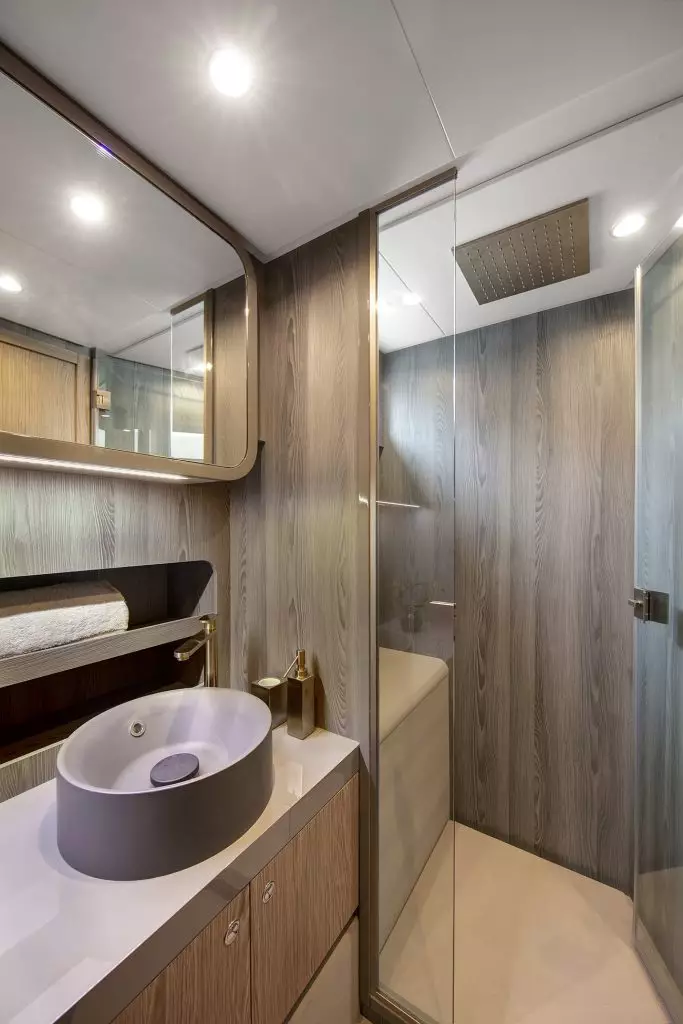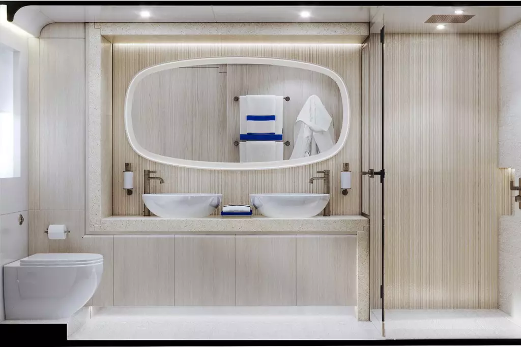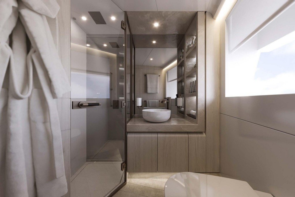 She is available in two versions: two cabins + crew cabin or three cabins + crew cabin. Interiors are built lightweight with extensive use of carbon fibre, foam cored anti-noise and vibration pavement and high-tech honeycomb furniture production process by iconic Canados cabinetry makers. With a beam of 4,73 m /15’6”, the widebody owner’s suite offers ample spaces.