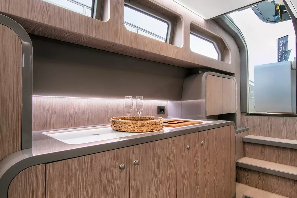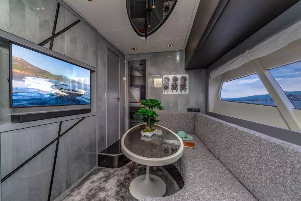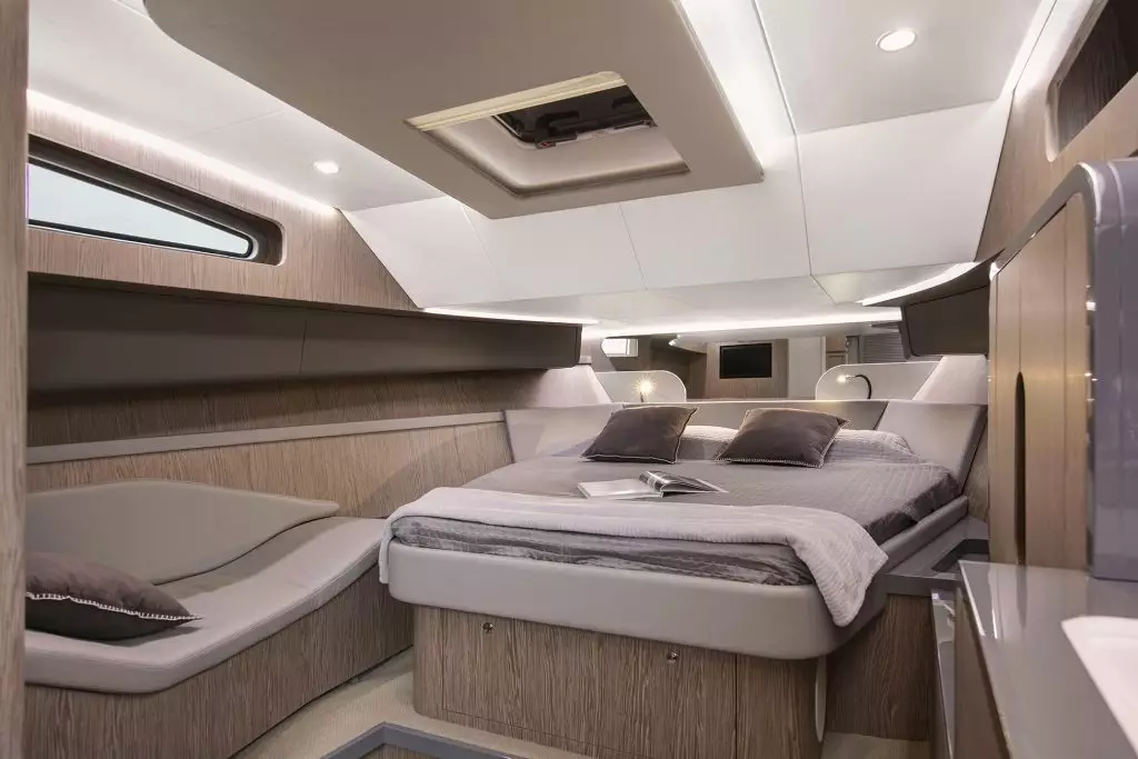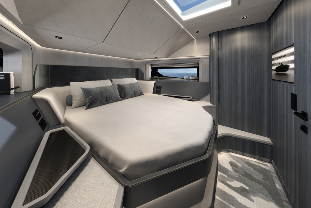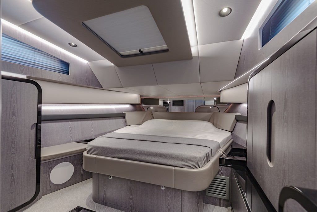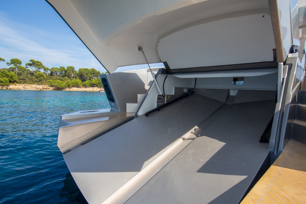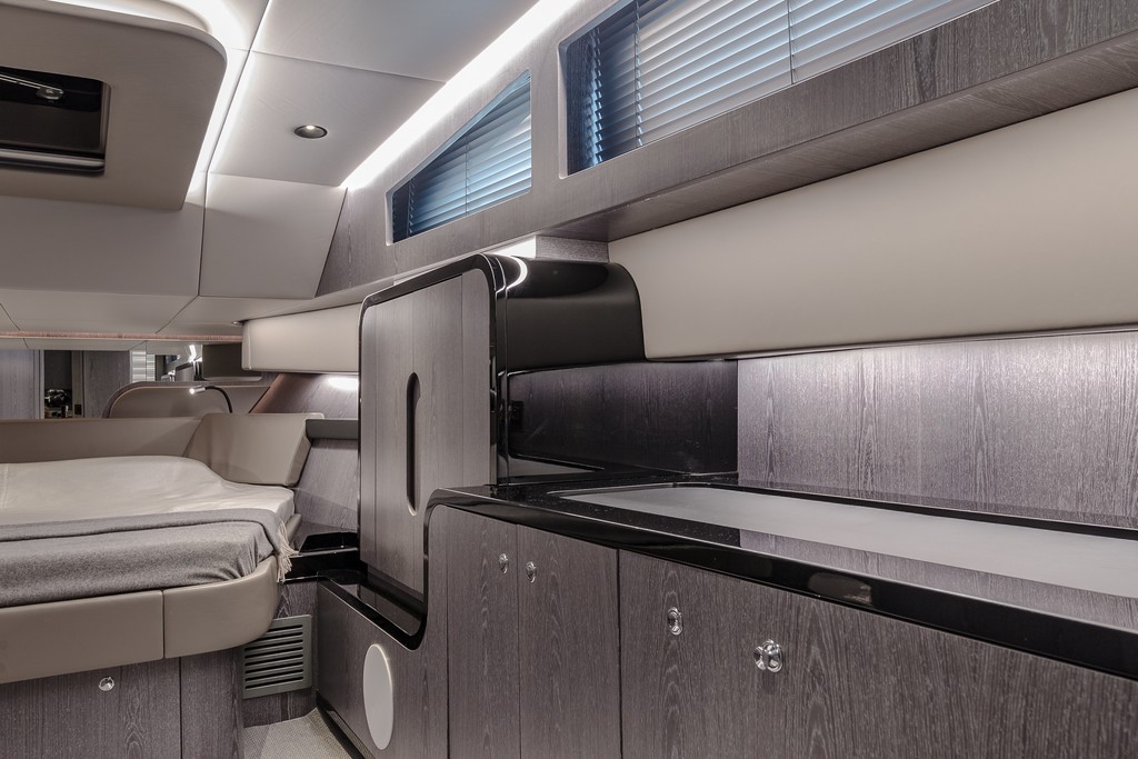 Inside, to starboard side is a long curved top furniture offering plenty of storage, while to port is a full bath equipped with carbon fiber fixtures. The fore section comes with an island bed and a side couch. As an option, she can be equipped with a second cabin with a queen size berth. Inside and outside, quality and detail are to the level of a super yacht.