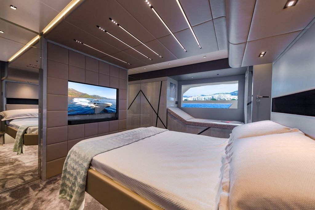 Down below, the boat is offered either with three cabins and a home cinema or four cabins. Hull number one will be a four-cabin layout with the full beam master in the centre of the boat, two twins on each side and the VIP at the bow.
